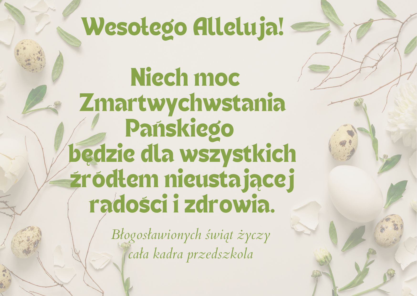 Choć Święta Wielkanocne jeszcze przed nami to w naszym Przedszkolu wybrzmiało już radosne ALLELUJA!!! Zebraliśmy się wszyscy by w rodzinnej atmosferze składać sobie życzenia, dzielić się szczęściem jakie płynie ze Zmartwychwstanie Pana Jezusa. Ze śpiewem na ustach przywitaliśmy Księdza Proboszcza Andrzeja Paliszek-Saładygę, który poświęcił koszyczki wielkanocne, udzielił nam błogosławieństwa i sowicie pokropił nas wodą święconą, nawiązują oczywiście do tradycji śmigusa-dyngusa. Radości i niespodzianek nie było końca.